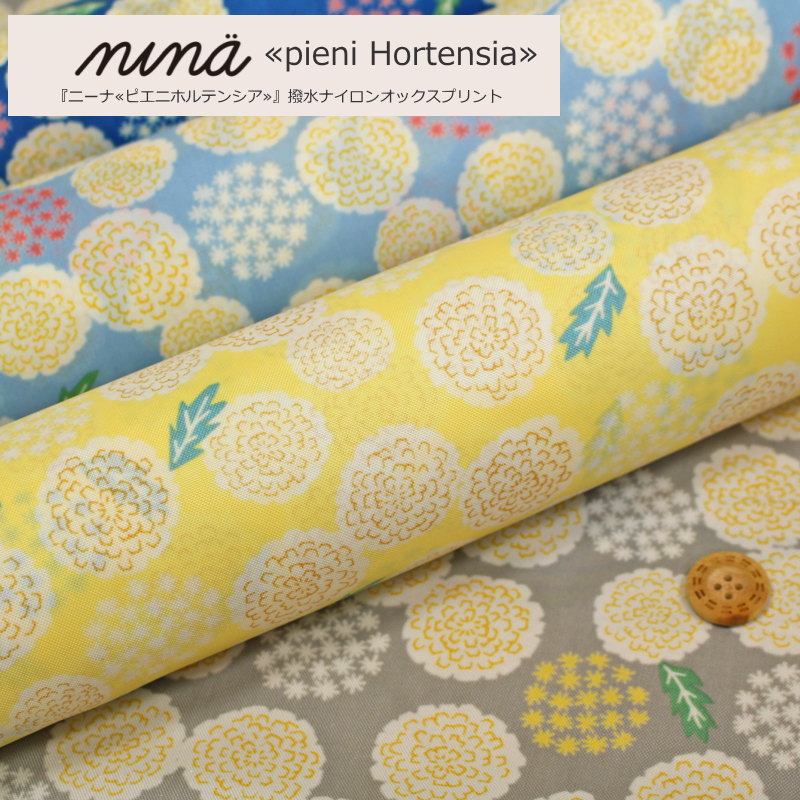 nina≪ニーナ≫『pieni Hortensia≪ピエニホルテンシア≫』撥水ナイロンオックスプリント素材:ナイロン100% 生地幅:約116cm北欧/あじさい/花柄/女の子/キッズ/大人/ウェアー/小物/インテリア/ハンドメイド/