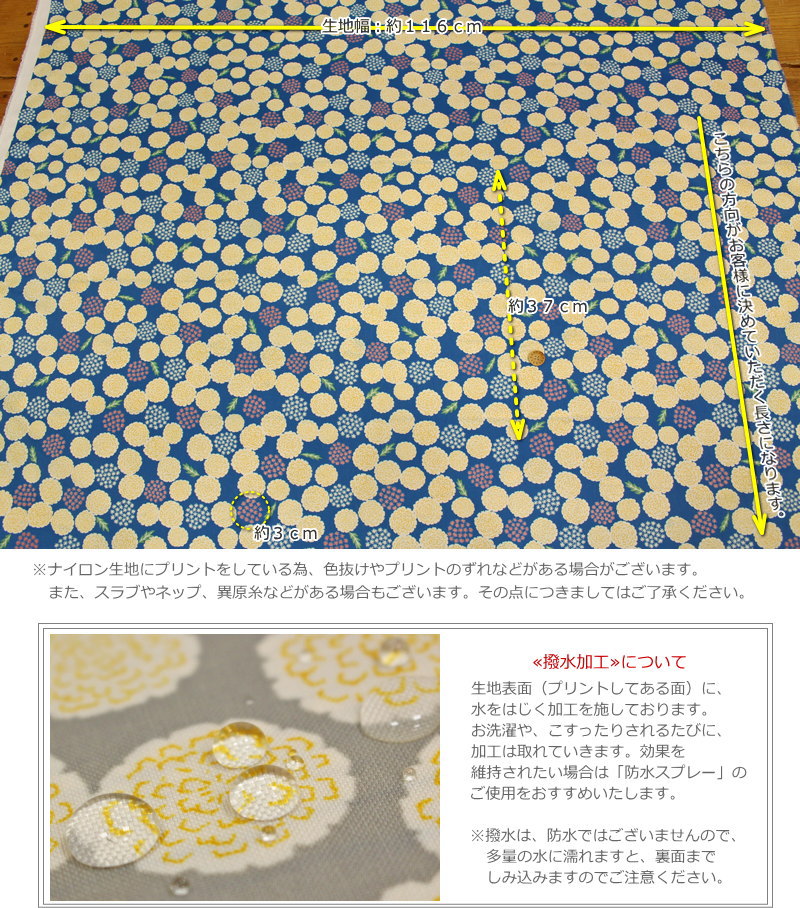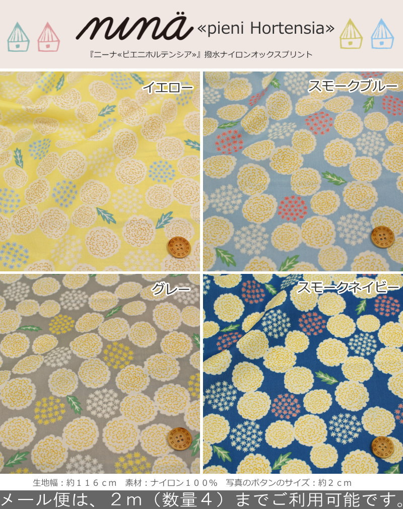 素材:ナイロン100% 生地幅:約116cm ※こちらの生地に合うオススメの糸の色は 【イエロー:30番】 【スモークブルー:358番】 【グレー:163番】 【スモークネイビー:93番】 になります。