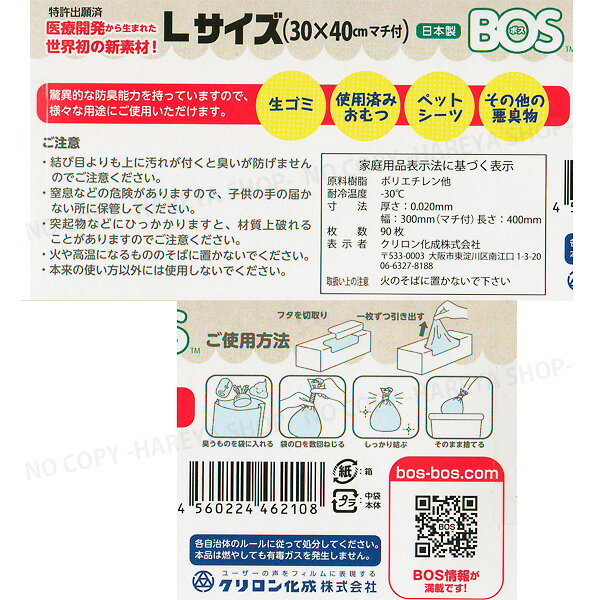 驚異の防臭袋BOS Lサイズ90枚入(箱) 【Sサイズ15枚入サービス中】 W300×H400mmマチ付白色 臭いがもれない画期的な袋 ゴミ袋 クリロン化成